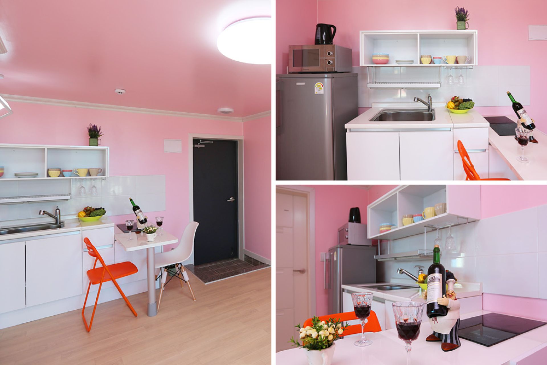 - 시설 : 에어컨, TV, 냉장고, 전자레인지, 커피포트, 주방도구일체, 헤어드라이어, 샴푸, 린스, 바디클린저 등 세면도구 일체
